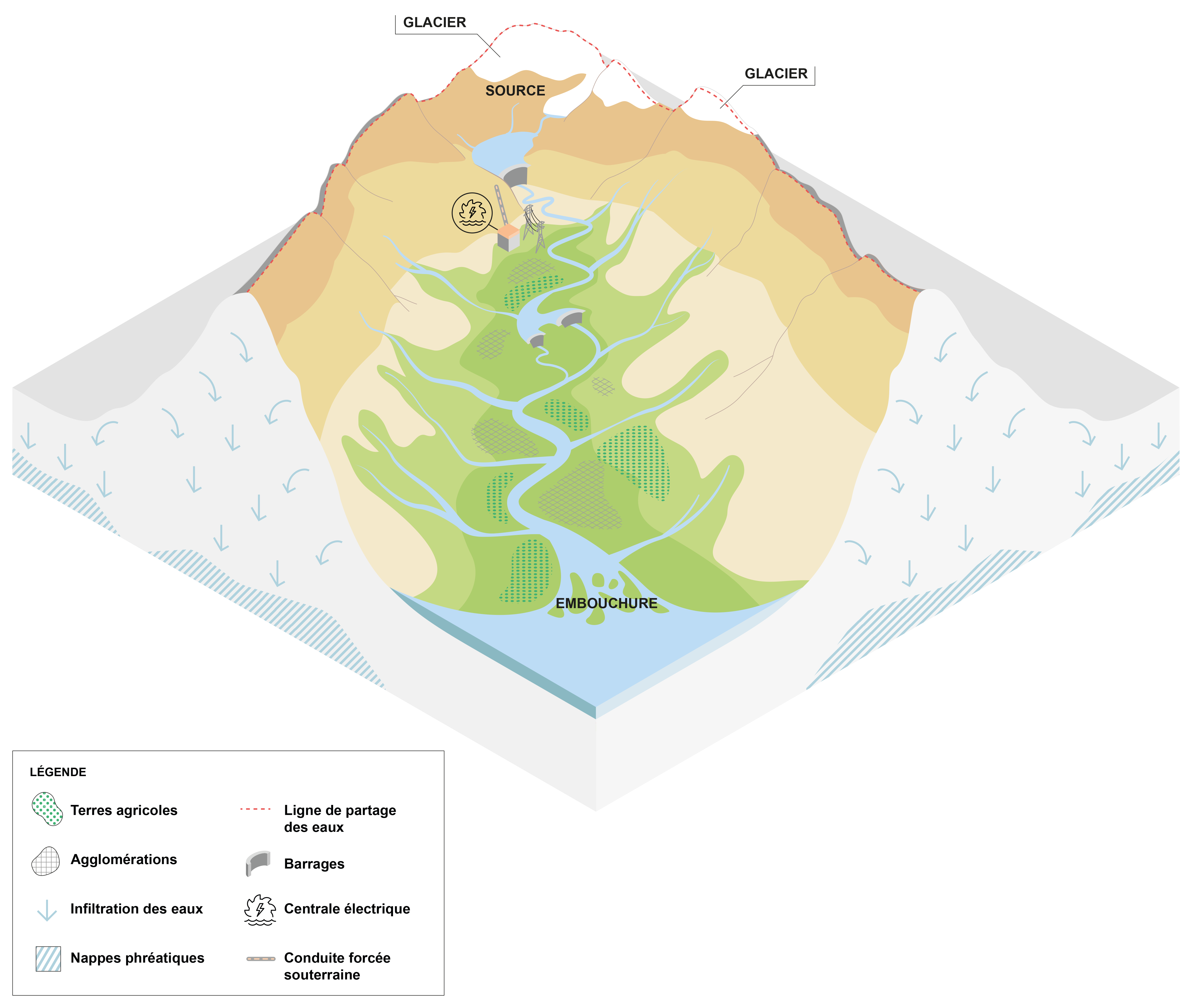 Le bassin versant est un espace géographique – un territoire – où les eaux provenant de la pluie et de la fonte des neiges se rejoignent. Il y a les eaux de surface, c’est-à-dire les cours d’eau tels que les ruisseaux, les torrents et les rivières. Ces cours d’eau finissent dans un fleuve qui débouche dans la mer. Et il y a les eaux souterraines, qui forment des réservoirs après s’être infiltrées dans le sol. Toute cette eau, c’est de l’eau douce.